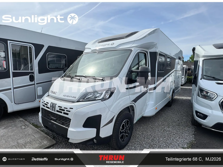 - Adventure Ausstattung 68C (Fiat Ducato 3.500 kg | 2.2 | 103 kW | 140 PS Euro 6 | 6-Gang-Schaltgetriebe, Fiat Weiß, Adventure Beklebung, Wohnwelt Adventure, Design Applikation Heck, Fenster in Fronthaube, Rahmenfenster, 2. Außenstauraumklappe (Größe modellabhängig), Großer Kühlschrank 156 l mit separatem Frosterfach 29 l, Bettenumbau Einzelbett zu Doppelbett, Paket One Black (Markise, Fahrradträger 3-fach), Bridge Light, Komfort Eingangstür mit Fenster, Fliegengittertür (einteilig), Panoramadachhaube 70 x 50 cm, Klarglasdachhaube 40 x 40 cm, Stoßfänger lackiert, Skid Plate Schwarz, Nebelscheinwerfer, Lenkrad & Schaltknauf in Lederausführung, Luftauslässe mit Applikationen Silber (Techno-Trim), 16" Alufelgen Bi-Color)