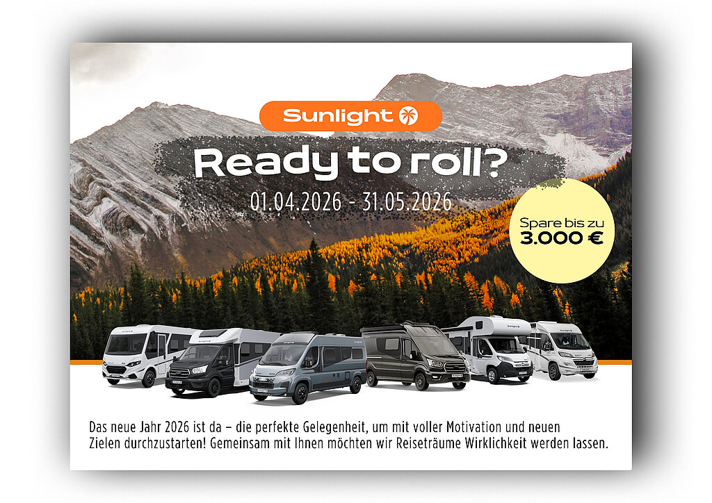 Das neue Jahr 2026 ist da – die perfekte Gelegenheit, um mit voller Motivation und neuen Zielen durchzustarten! Gemeinsam mit Ihnen und Sunlight möchten wir Reiseträume Wirklichkeit werden lassen. (Aktion im Endpreis enthalten). Hier finden Sie alle Sunlight Fahrzeuge + ready to roll?